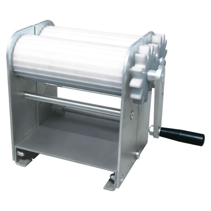 無(wú)骨肉被擠入相對(duì)轉(zhuǎn)輥之間的縫隙。輥軸通過(guò)特殊的輪齒嚙合。間隙用偏心輪實(shí)現(xiàn)可調(diào),從而控制肉片厚度。