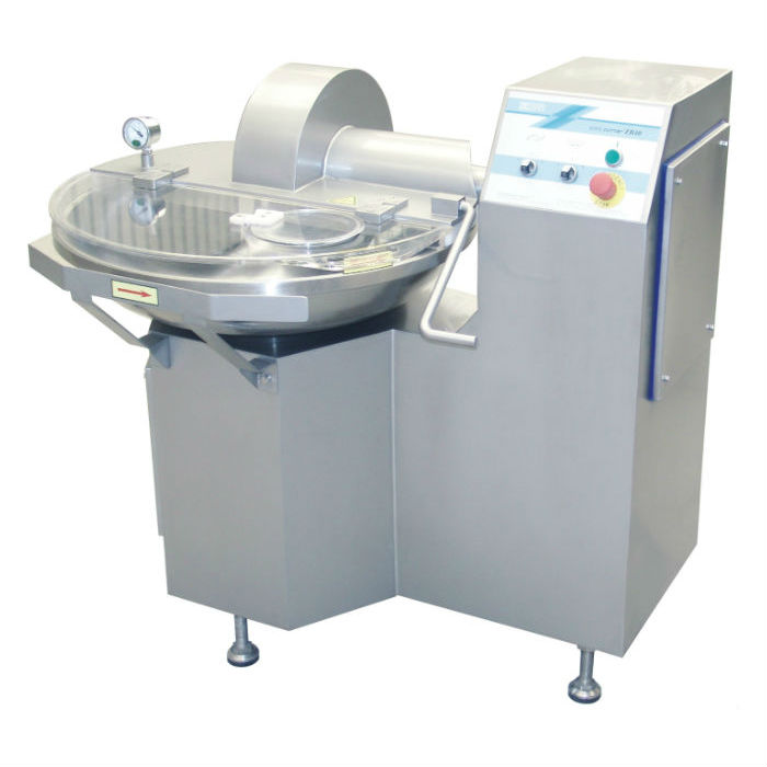 斬鍋由電機(jī)通過減速機(jī)低速旋轉(zhuǎn),不斷向刀組送料。刀軸由雙速電機(jī)(或變頻電機(jī))經(jīng)皮帶帶動(dòng)高速旋轉(zhuǎn)。原料在斬鍋中作螺旋式運(yùn)動(dòng)的同時(shí),被刀組攪拌和切碎并排除肉糜中的空氣,由于切刀的高速斬切,減少了產(chǎn)品的液汁分離率,保證了乳化效果,增強(qiáng)了產(chǎn)品的彈性和細(xì)膩度。