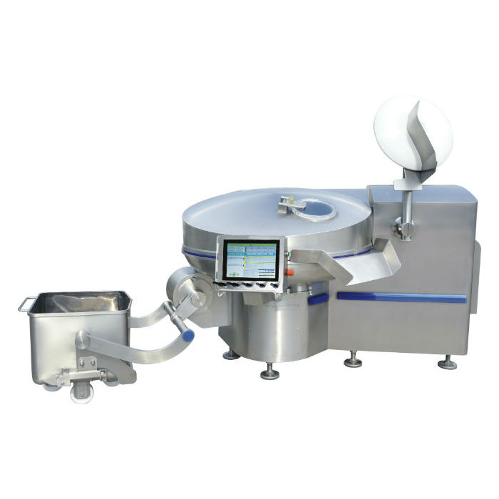 利用斬刀高速旋轉(zhuǎn)的斬切作用,將肉塊、碎肉、脂肪等主要原料精細(xì)的斬切成肉餡或肉泥,同時(shí)將其它原料如水,冰片,輔料一起攪拌均勻。